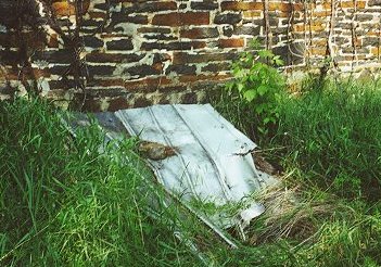 The basement is entered from an outside cellar door at the base of the east wall.