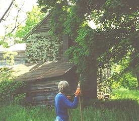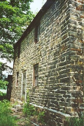 The cinder block chimney added around 1930 runs up the west wall. Craig Creek is to the right.