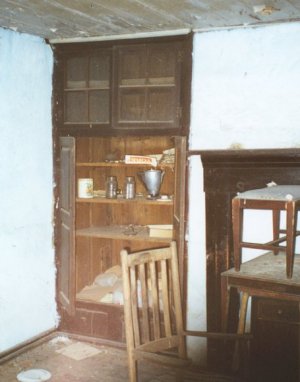 The fireplace in the east wall is bounded by a built-in cupboard on the left and an enclosed stairwell to the second floor on the right.